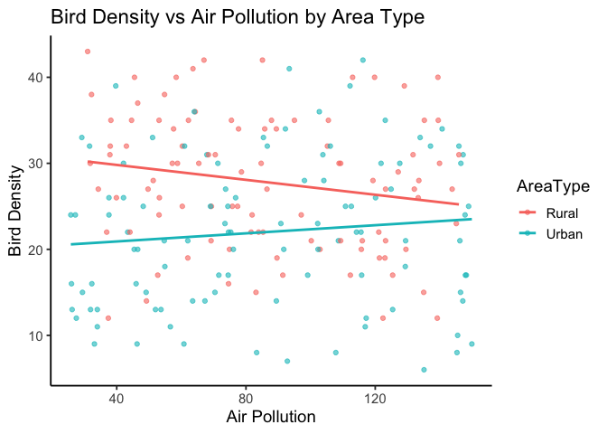 A scatter plot with fitted regression lines lets us see how air pollution relates to bird density for each area type.